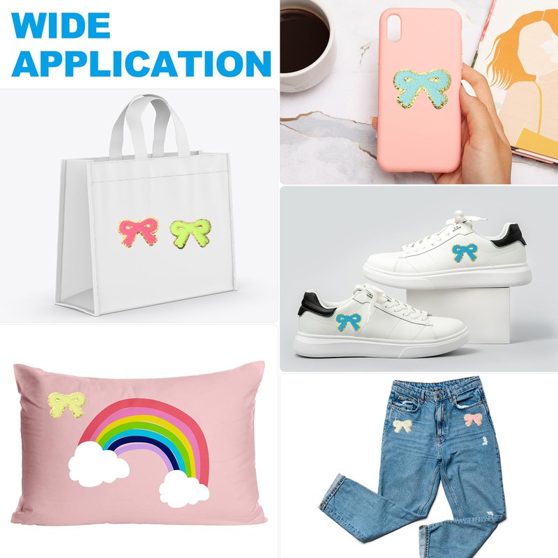 - Bow stickers are patches designed with soft chenille material and hot melt adhesive. It can be used for clothing, backpacks, hats, T-shirts, jeans, laptops, walls, mobile phone cases, cover patches, or decorating clothes, full of unique style and personalized design