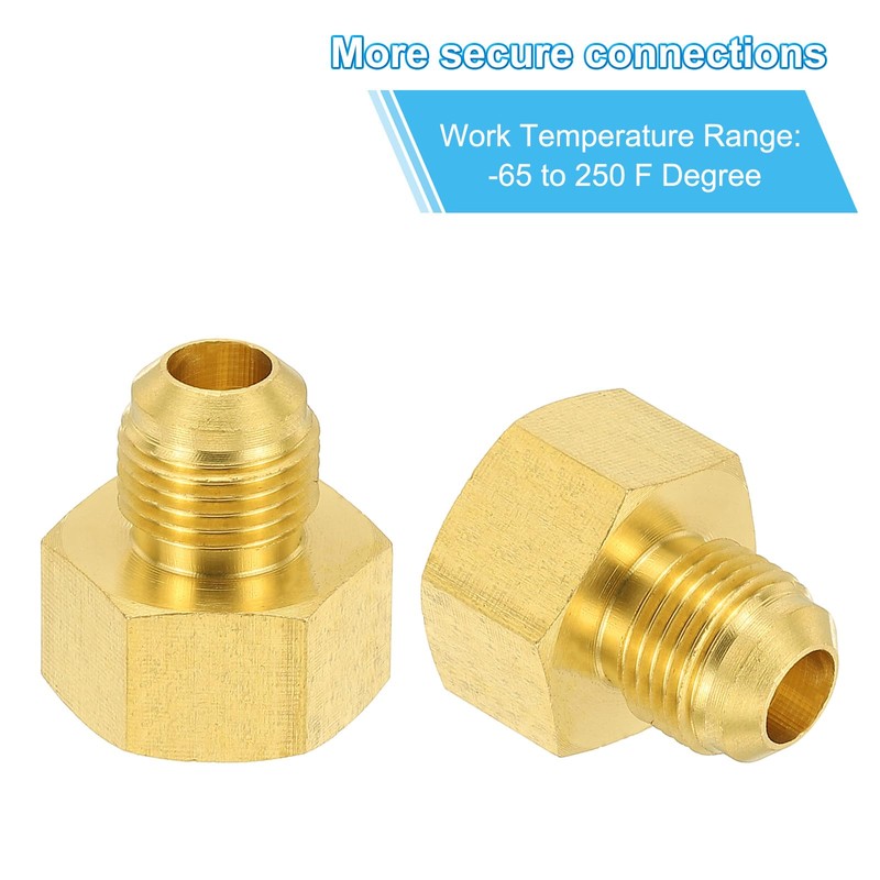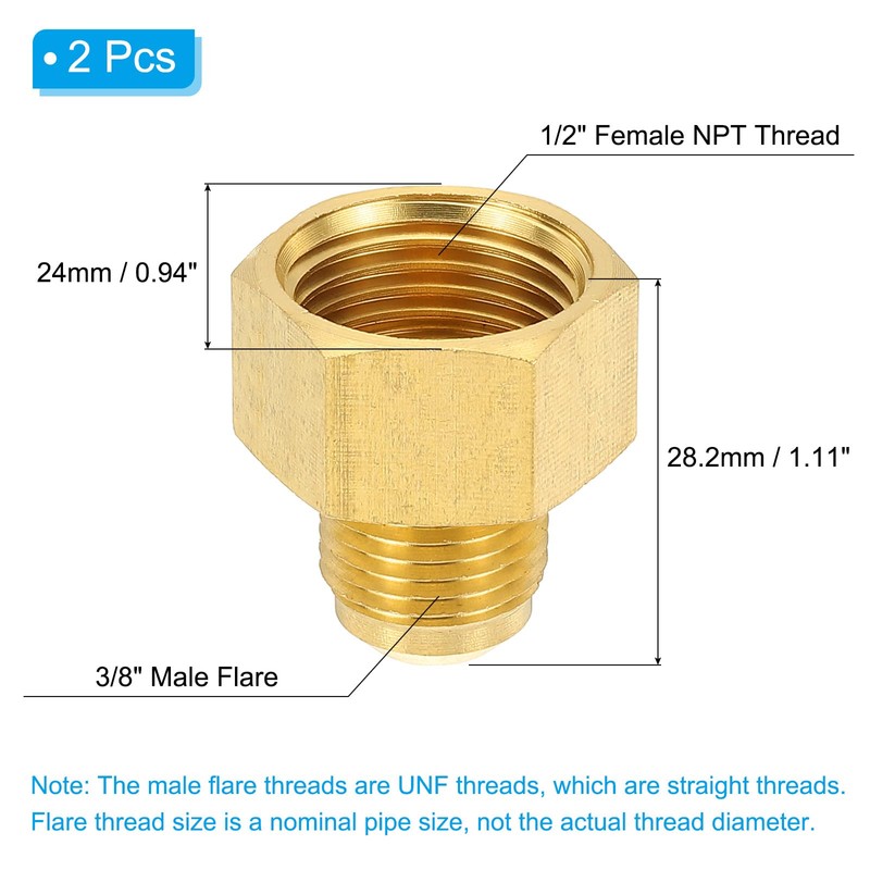 - Specification:Material:Brass;Thread Size:3/8" Male x 1/2" Female NPT Thread;Overall Size:28.2 x 24mm/1.1" x 0.94"(L*Hex Width);Package Content:2 Pcs x Flare Brass Coupler