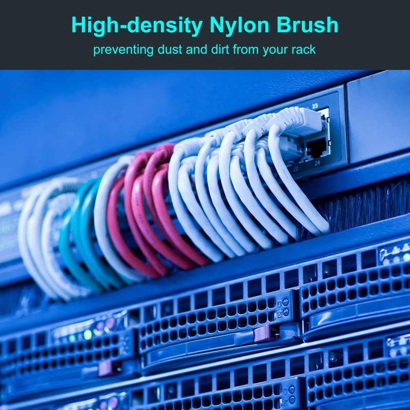 The data center cable management panel is with a high-density nylon brush strip and offers cable separation for a simple organization while preventing dust and dirt from your rack.