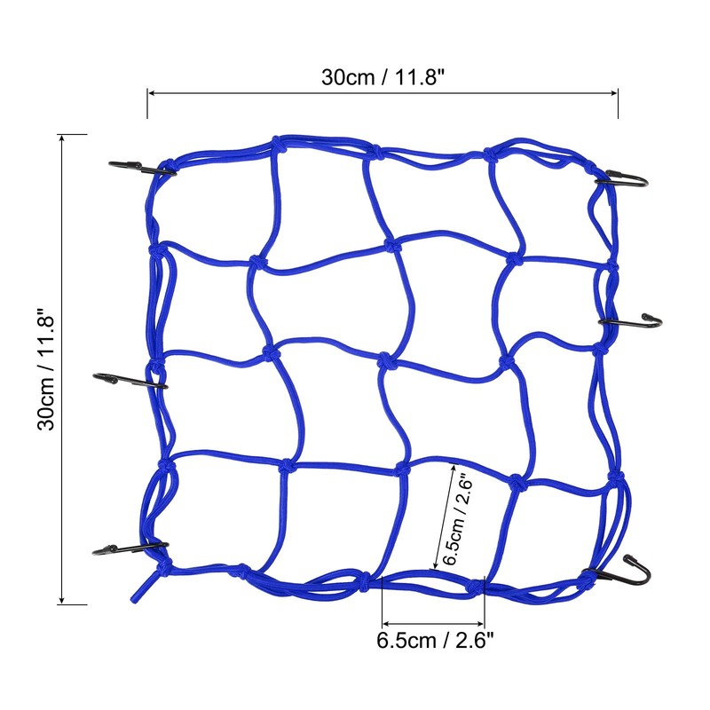 - Material: Nylon, Rubber; Size: 30cm x 30cm/ 11.8" x 11.8" (L*W); Grid Size: 6.5cm x 6.5cm/ 2.6" x 2.6" (L*W); Packing List: 3 x Cargo Net