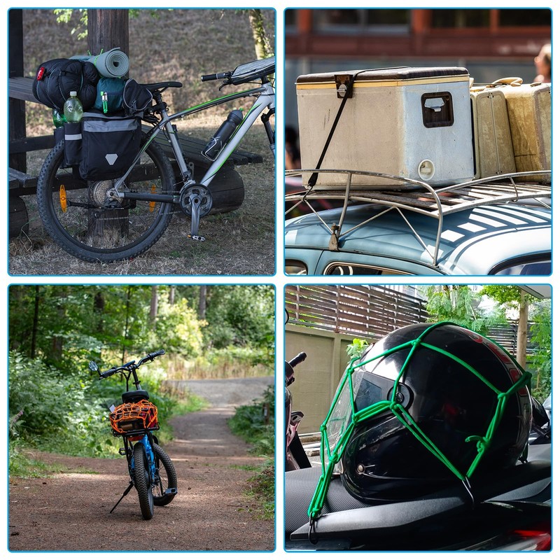 - Application: The 11.8" x 11.8" High Elastic Cargo Net with 6 Hooks is designed to securely hold and organize cargo on bicycles, motorcycles, and other outdoor equipment. This cargo net is perfect for securing items such as bags, helmets, groceries, and more. It helps keep your belongings in place, preventing them from shifting or falling off.