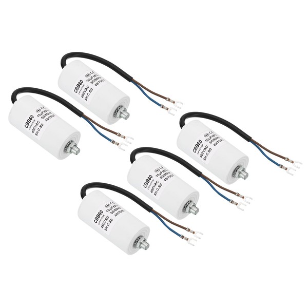 Model: CBB60; Material: Polypropylene Film Plastic Housing; Connector End: U Terminal Cable; Tolerance: ±5%; Rated Capacity: 10uf; Cable Length: 160mm/6.24inch(+/-20mm); Climate Category: 40/70/21; Housing Size: 35 x 65mm/1.37 x 2.54inch(D x H) EE)))))x1.25x12 mm; pack of 5 running capacitors.