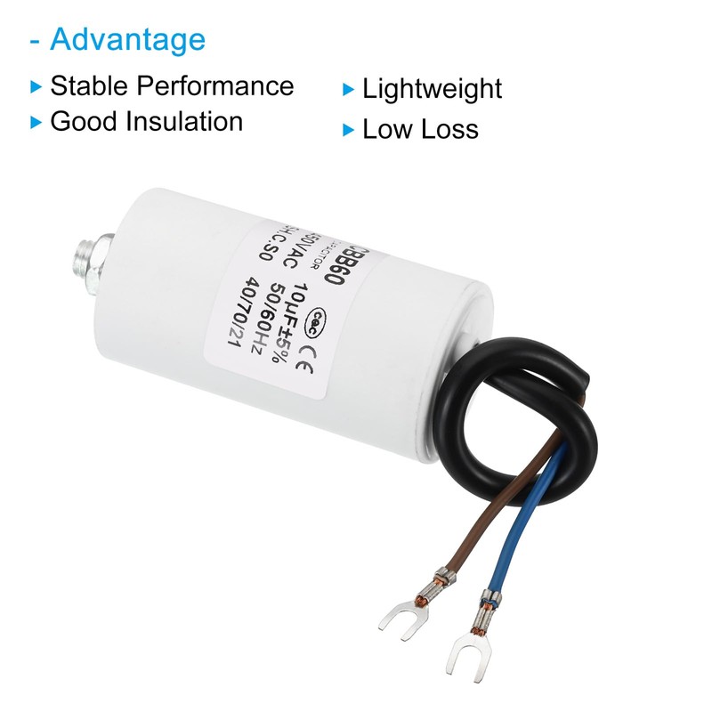 - Model: CBB60; Material: Polypropylene Film Plastic Housing; Connector End: U Terminal Cable; Tolerance: ±5%; Rated Capacity: 10uf; Cable Length: 160mm/6.24inch(+/-20mm); Climate Category: 40/70/21; Case Size(+/-3mm): 35 x 65mm/1.37 x 2.54inch. (D x H); Screw size: M8 x 1.25 x 12 mm; pack of 5 running capacitors