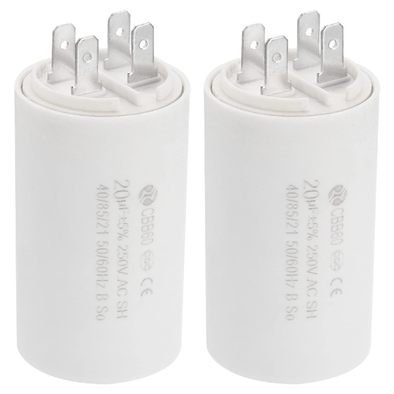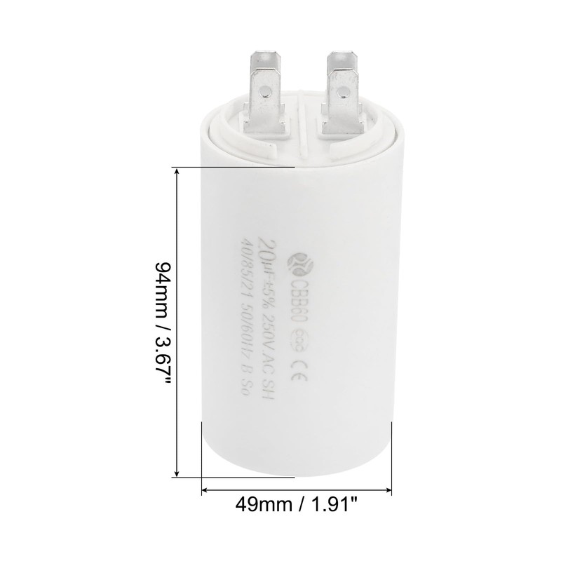 - Model: CBB60;Material: Polypropylene Film; PP shell; Lead End: 4 pins;Tolerance: ±5%;Rated Capacity: 20uF;Rated Voltage: 250VAC;Rated Frequency: 50/60Hz;Climatic Category: 40/85/21;Body Size: 39 x 65mm/1.52 x 2.54inch(D x H);Pack with 2Pcs CBB60 Capacitor