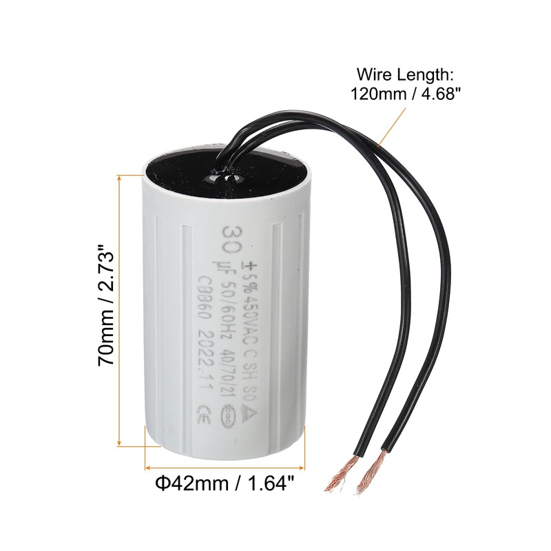 - Specification: CBB60 30uF Running Capacitor, AC 450V 2 Wires 50/60Hz Cylinder for Water Pumps,Washing Machines Motor Start