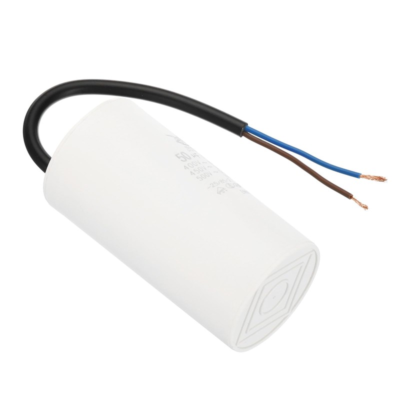 - Model: CBB60; Material: Polypropylene Film Plastic Shell; Lead End: 2 Wires; Tolerance: ±5%; Rated Capacity: 50uf; Climatic Category: 25/85/21; Body Size: 97 x 50mm/3.78 x 1.95inch(H x D);Shell Color: White; Wire Length: 200mm/7.8inch;; Pack of 1Pcs Run Capacitor
