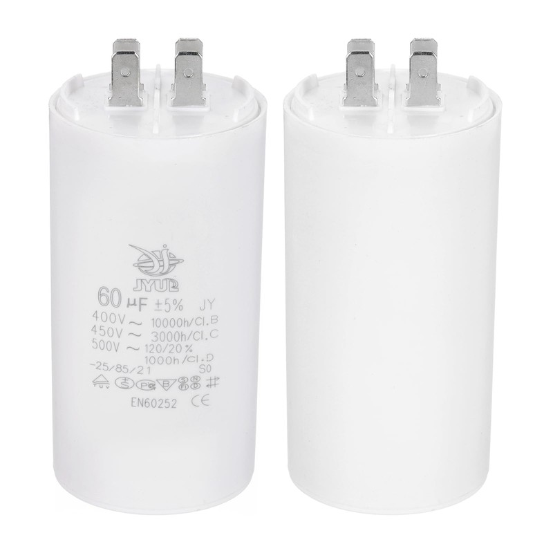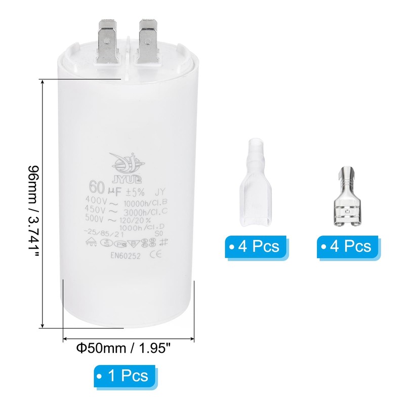 Model: CBB60; Material: Polypropylene Film Plastic Shell; Lead End: 4 Pins; Tolerance: ±5%; Rated Capacity: 60uF; Climatic Category: -25/85/21; Pack of 1 Pcs Run Capacitor, Each capacitor is paired with four Sheath Spring