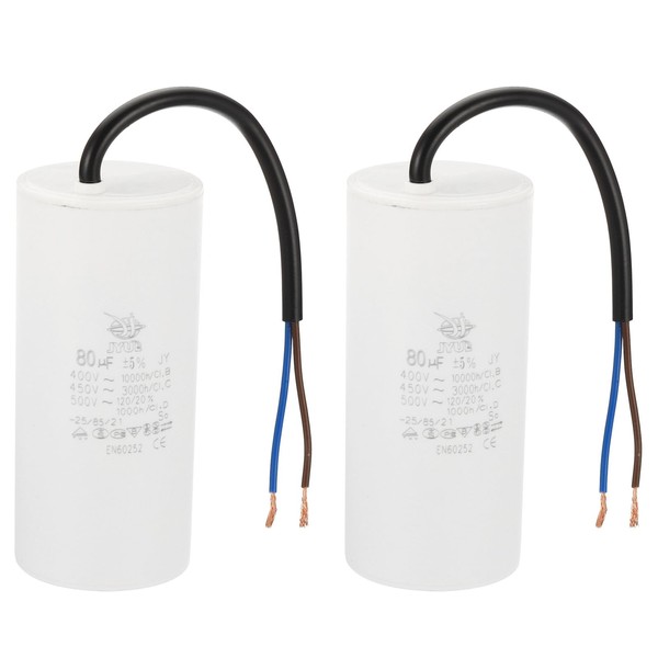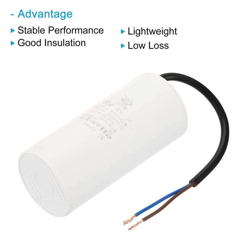 - Model: CBB60; Material: Polypropylene Film Plastic Shell; Lead End: 2 Wires; Tolerance: ±5%; Rated Capacity: 80uf; Climatic Category: 25/85/21; Body Size: 120 x 54mm/4.68 x 2.11inch(H x D);Shell Color: White; Wire Length: 200mm/7.8inch;; Pack of 2Pcs Run Capacitor