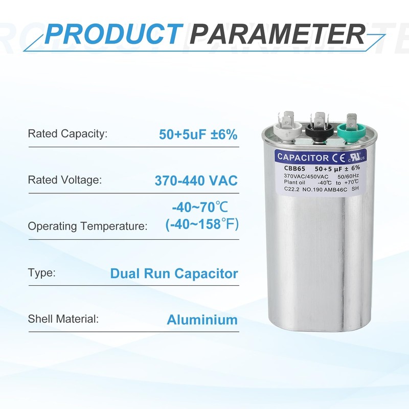 - Advantage: Excellent Durability: Metal shell made from aluminium material provides enhanced durability and mechanical protection, while the great heat dissipation of aluminium could reduce the risk of overheating, ensures a stable and reliable working performance. High Voltage Adaptability: This CBB65 motor starting capacitor can adapt to high voltage up to 440VAC, very suitable for various motor starting scenes.