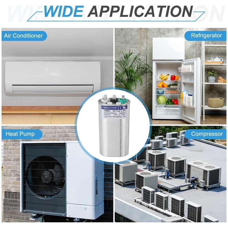 Versatile Use: With a wide range of use, this CBB65 capacitor could be used in motor running applications like air conditioner, refrigerator, heat pump, compressor, etc.