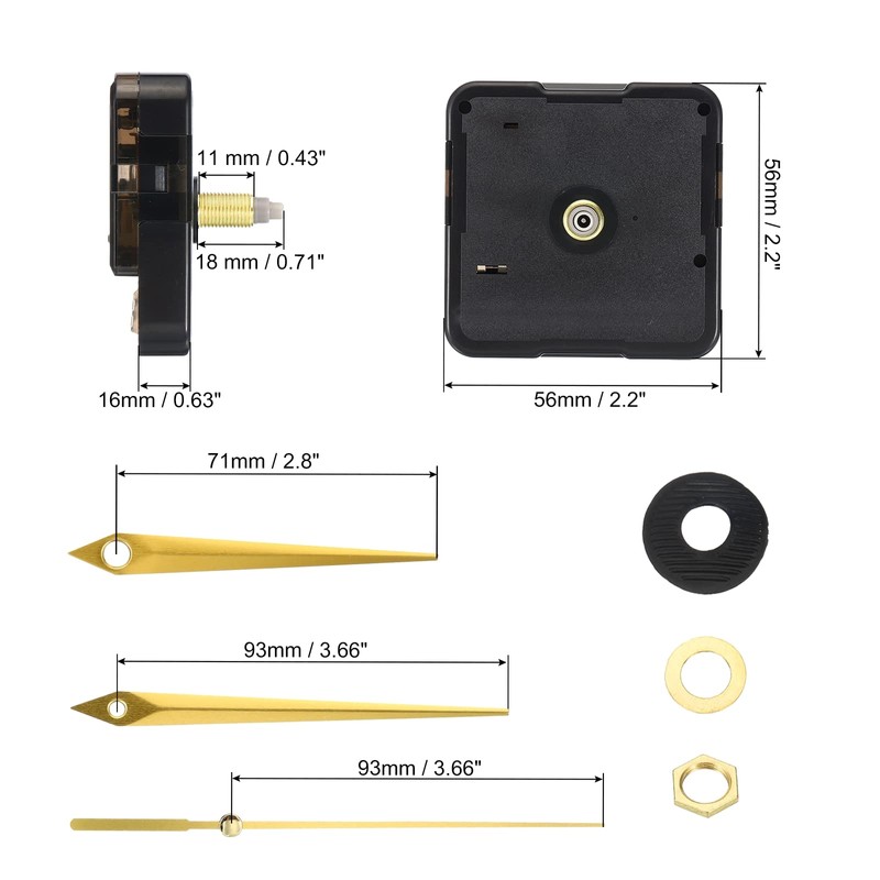 - Thread Length: 11 mm / 0.43 inch;Movement Shaft Length: 18 mm / 0.71 inch;Movement Box Size: 56 x 56 x 16 mm/ 2.2 x 2.2 x 0.63 inch (L*W*T);Clock Hands Length: 71 x 93 x 93 mm / 2.8 x 3.66 x 3.66 inch (Hour Hand*Minute Hand*Second Hand);Suitable for Clock Face Thickness: 7-8 mm / 0.28-0.31 inch