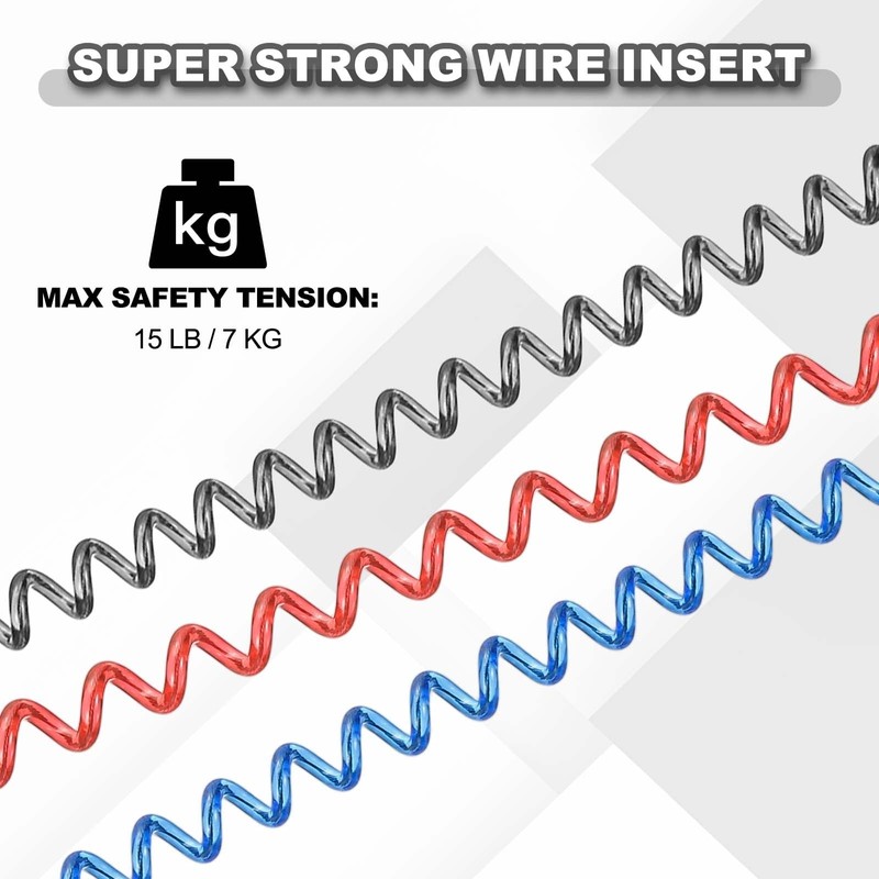 - Color: Black/Red/Blue; Material: PP, Nylon; Max Stretch Length: 120 cm/47 Inch; Max Safety Tension: 15 lb/7 kg; Total Length: 32 cm/12.6 Inch; Rope Length: 23 cm/9.06 Inch; Lower Rope Length: 5.1 cm/2.01 Inch; Wire Length: 2.2 mm/0.09 Inch; Buckle Length: 5 cm/2 Inch; Package Content: 6 x Coiled Lanyards With Buckle(Two of Per Color)