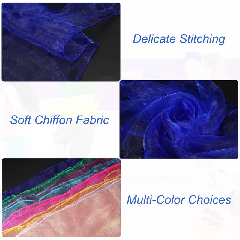 1. These Dance Scarves are made of chiffon fabric, soft and comfortable. These scarves are well-made with fine stitching, edges are sturdy, and wear-resistant.