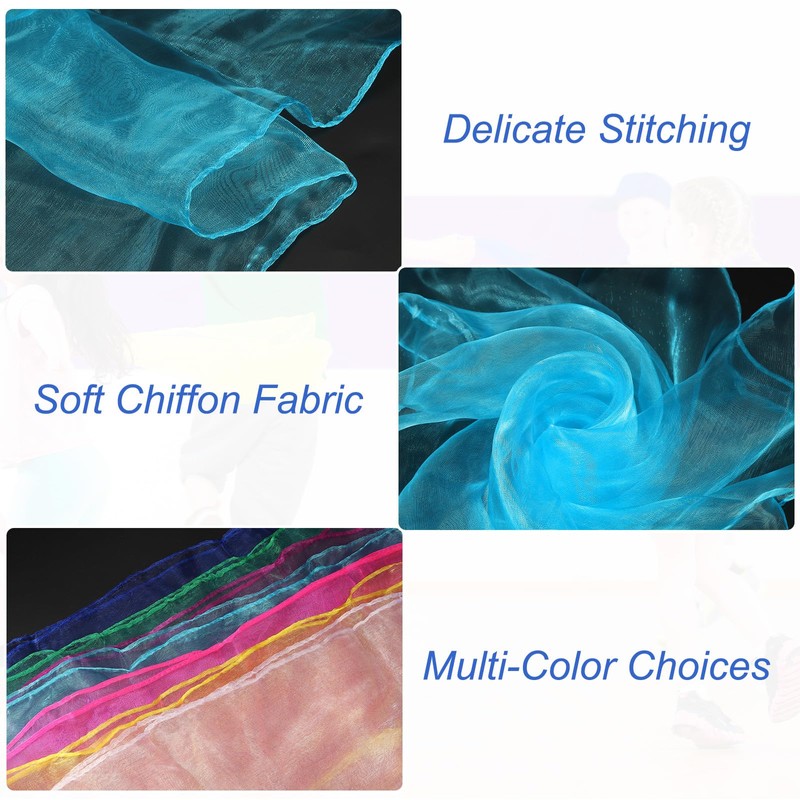 - Advantage: The Dance Scarves are made of chiffon fabric, soft and comfortable. These scarves are well-made with fine stitching, edges are sturdy, and wear-resistant. These Juggling Scarves are brightly colored, which can double as a decorative piece that adds a festive touch when used at events or parties