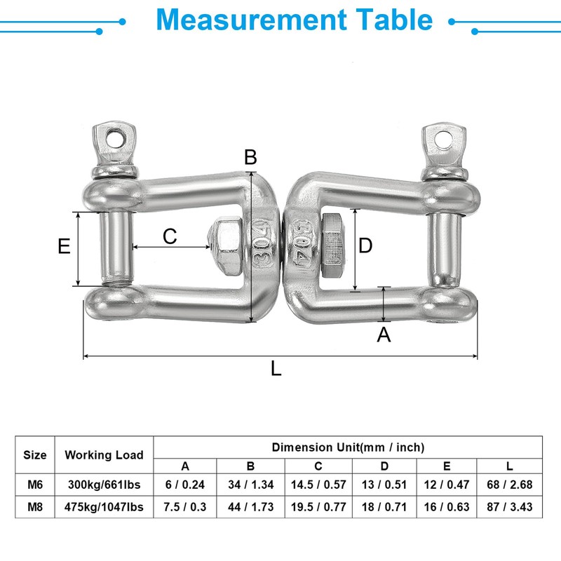 - Loop Dia: 6mm / 0.24 inch; Working Load Limit: 300KG / 661LBS; Eye Inner Size: 14.5 x 13mm / 0.51 x 0.57 inch (L*W); Overall Size: 67 x 34mm / 2.64 x 1.34 inch (L*W); Packing List: 2 x Jaw to Jaw Swivel Shackle