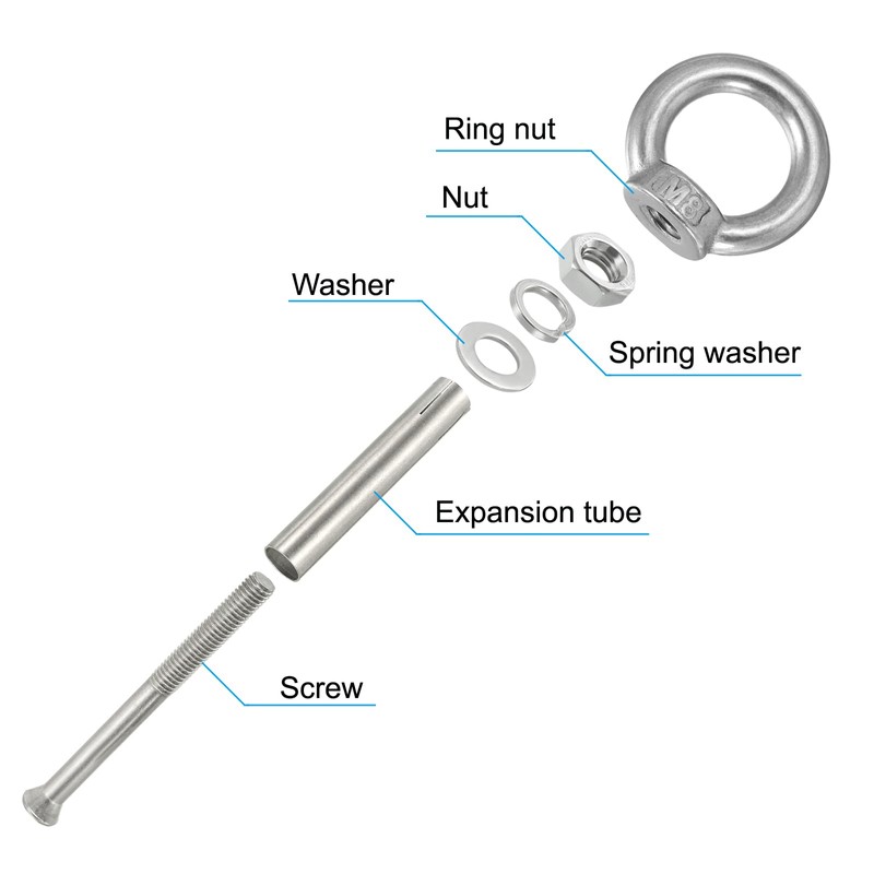 - This expansion eyebolt can be used as connection points for rigging, anchoring, pulling, pushing, hoisting objects, or fixing jaws, loops, and hooks and can be used in fences, home decoration, fixing rope, awnings, air conditioners, ceilings, burglarproof, doors and window canopies, fixation, cement bricks, concrete masonry, and engineering, shipbuilding, port, mining, railway.