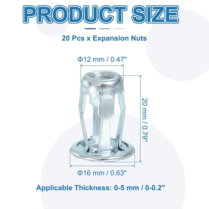 - Sleeve Diameter: 16 mm / 0.63 Inch; Sleeve Length: 20 mm / 0.79 Inch; Gasket Diameter: 16 mm / 0.63 Inch; Screw Size: M6; Applicable Thickness: 0-5 mm / 0-0.2 Inch; Packing List: 20 Pcs x Expansion Nuts