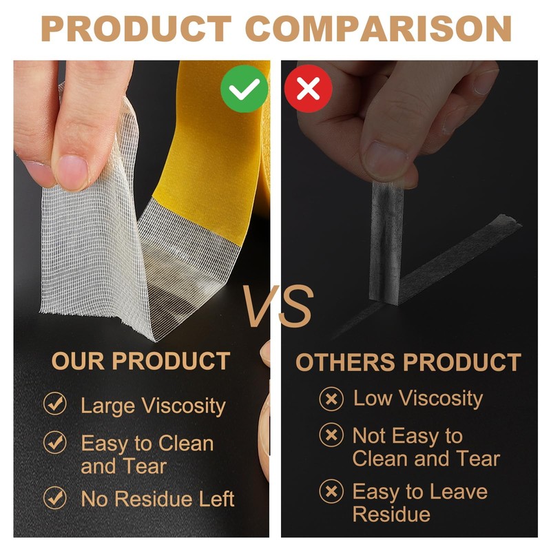 - Advantage: High-viscosity adhesive fabric tape is woven from a cloth base, and the strong mesh cloth and high viscosity make the double-sided tape have strong adhesion and flexibility. No residue, easy to clean, no annoying glue or residue will be left when torn off. Strong double-sided tape can firmly fix carpets or other objects in place.