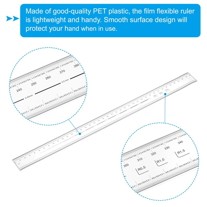 - Advantage: Made of good-quality PET plastic, the film flexible ruler is lightweight and handy. The smooth design will protect your hand when in use. With high-contrast markings, the film ruler ensures effortless, accurate reading of each line and number.