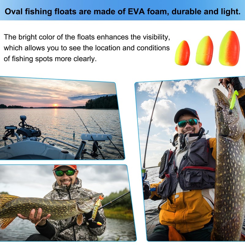 - Advantages: Oval fishing floats are made of EVA foam, durable and light. Not easily absorb water and has excellent floating performance. Enough quantity ensures various fishing needs. The bright color of the floats enhances the visibility, which allows you to see the location and conditions of fishing spots more clearly.
