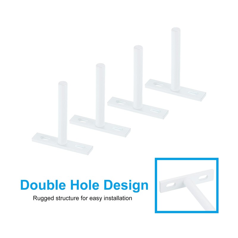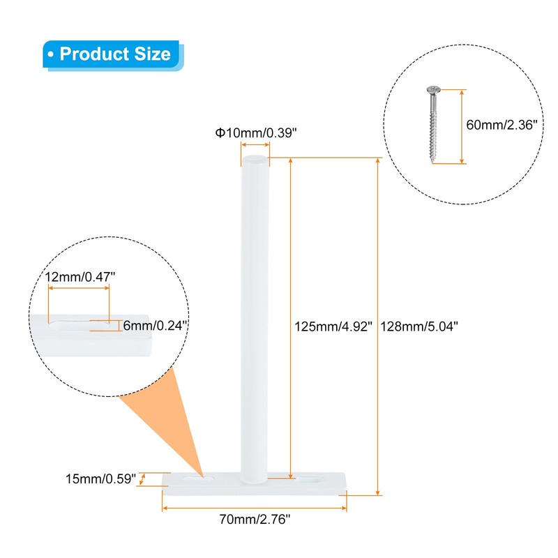 - Overall Size: 128x15x70mm/5.04x0.59x2.76inch (L*W*H); Hole Center Distance: 42mm/1.65inch; Rod Size: 125x10mm/4.92x0.39inch (L*Dia); Base Thickness: 4mm/0.16inch; Base Aperture: 12x6mm/0.55x0.24 (L*W); Size of Mounting Screws: 60x5mm/2.36x0.2inch; Packing List: 4 Set x Floating Shelf Bracket and 2 x Mounting Screws