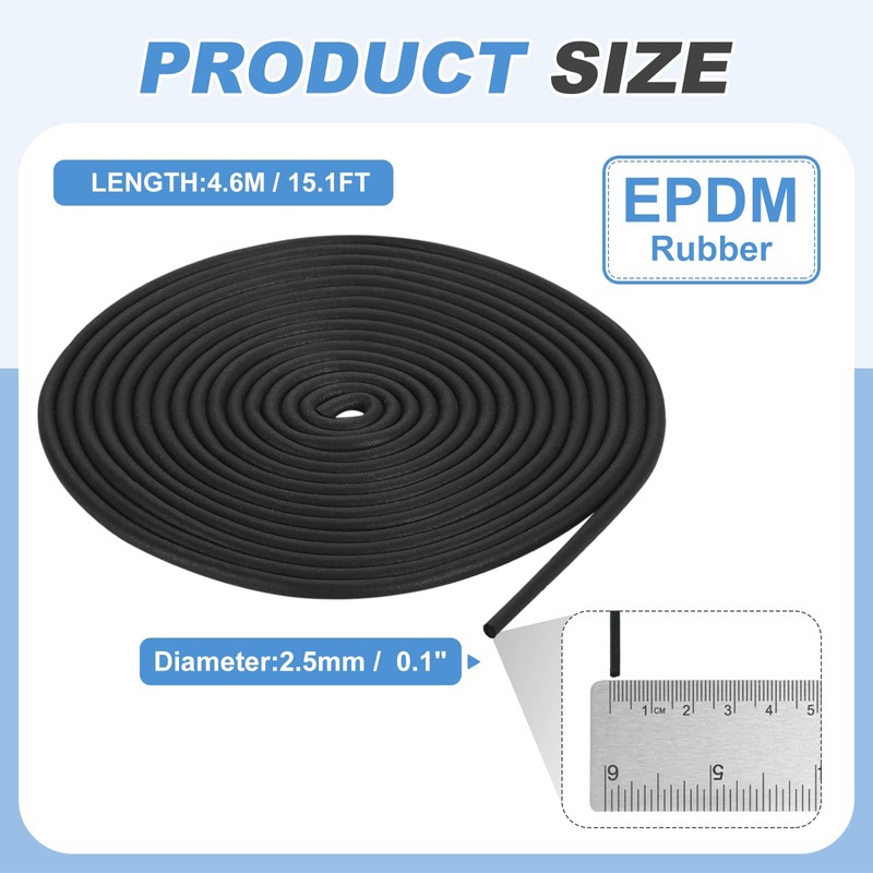 - Specification: Material: EPDM Rubber; Color: Black; Size: 4.6m x 2.5mm / 15.1Ft x 0.1 inch ( L * Dia ); Package List: 1 Pcs x Silicone Foam Seal Strip