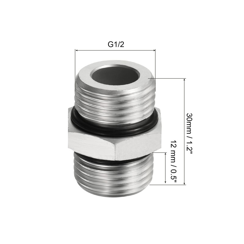 - External Thread: G1/2; Male Thread Length: 12 mm; Overall Dimensions: 30 x 24 mm (L*W); Color: Silver Tone; Material: Aluminum Alloy; Packing List: 1 x Pipe Adapter Fitting