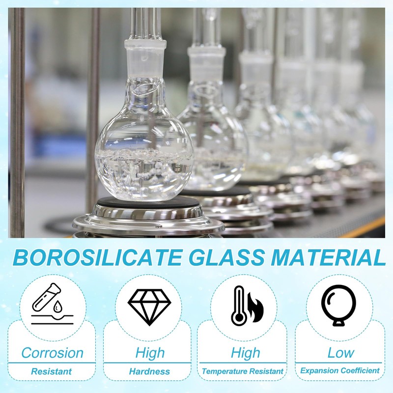 Made of thick borosilicate glass material, it is corrosion-resistant, high hardness, high temperature resistant, low expansion coefficient. The uniform wall thickness makes it better for chemical experiments and ensures a tight and secure connection between glassware, preventing leaks or spills during experiments.