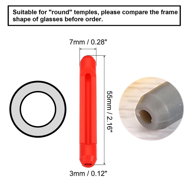 - Suit for Round Thin Metal Eyeglass Temple; Color: Red; Material: Silicone Rubber; Inner Diameter:3mm / 0.12"; Size: 55mmx7mm / 2.16"x0.28"(L*W); Package List: 5 pair of eyeglass temple end tips