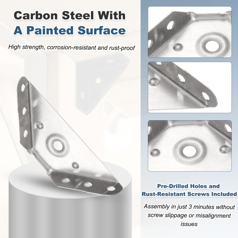 The angle bracket features pre-drilled holes and comes with rust-resistant screws, ensuring assembly in just 3 minutes without screw slippage or misalignment issues.