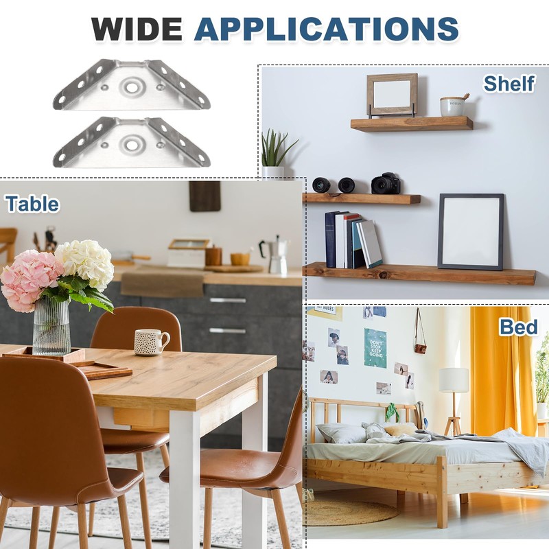 - The corner braces are suitable for floating shelves, fixed wooden frames, beds, tables, cabinets, desks, and various furniture pieces. They can be used in homes, offices, factories, and more.