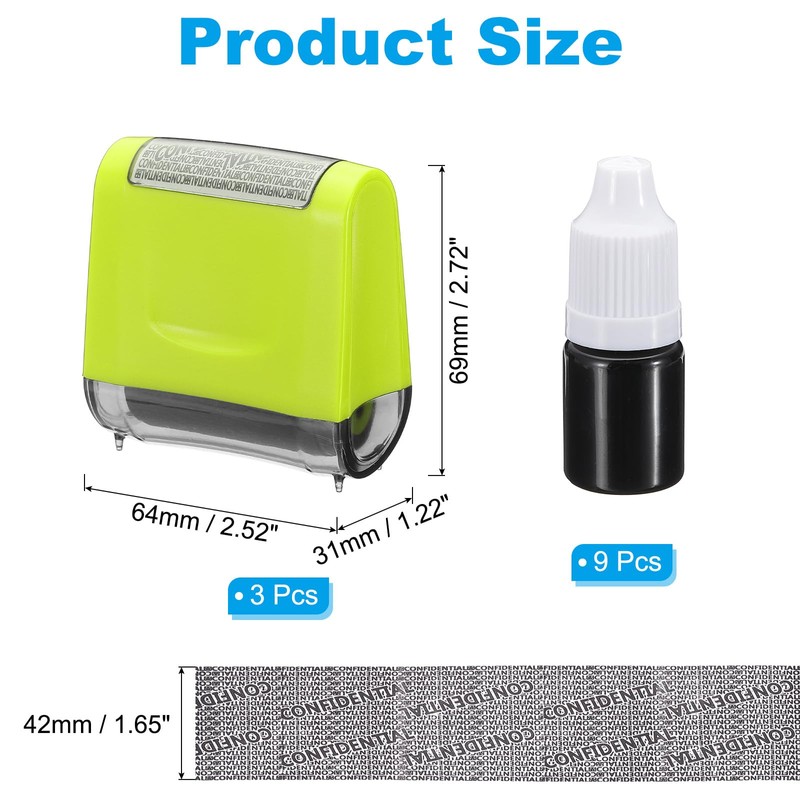 - Specification: Color: Light Green; Material: Plastic; Character Size: 42mm / 1.65 inch; Overall Size: 6.4 x 3.1 x 6.9cm / 2.52 x 1.22 x 2.72 inch (L x W x H); Packing List: 3Pcs x Identity Theft Protection Roller Stamp, 9Pcs x Stamp Oil