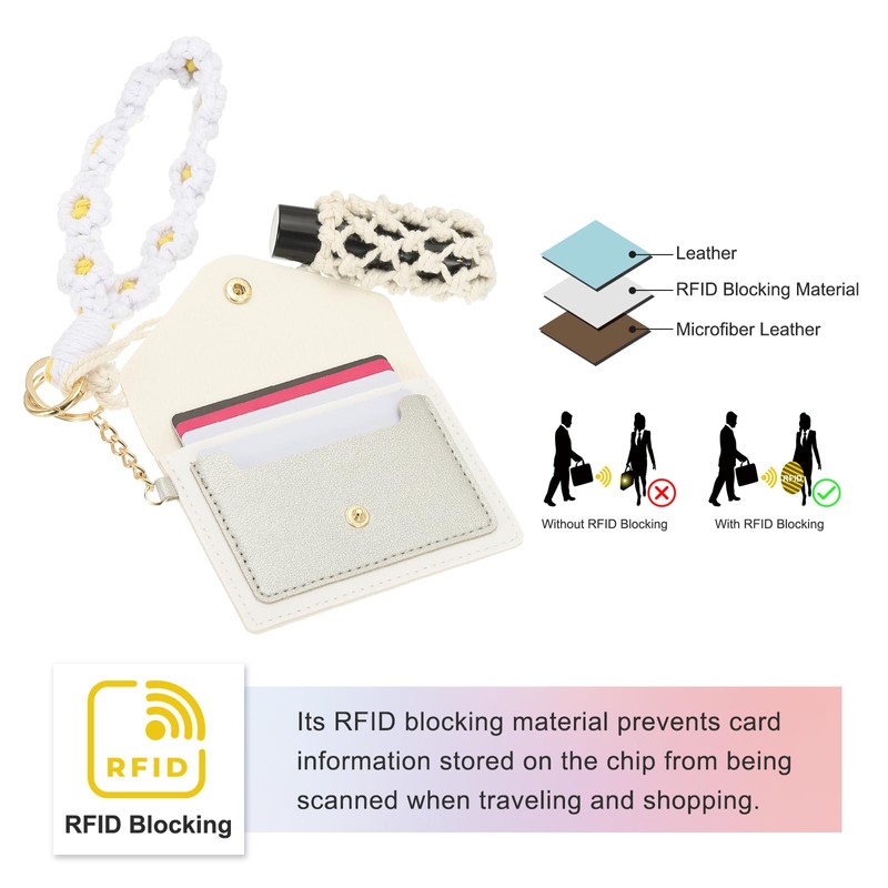 - Advantage: Made of PU leather material, scratch-resistant, with strong stitching for durability. Its RFID-blocking material prevents card information stored on the chip from being scanned when traveling and shopping. It has a small movable clasp and two card slots, which can hold 2-4 cards and a small amount of money. It also comes with a handmade cotton Wristlet and a mesh lip stick holder, which is lightweight and soft for easy carrying.