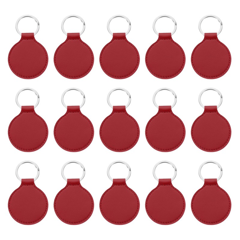 - Color: Dark Red; Material: PU Leather; Size: 1.97 inch * 0.13 inch / 50mm * 3.2mm (D*T); Packing List: 15Pcs x Keychain Blanks