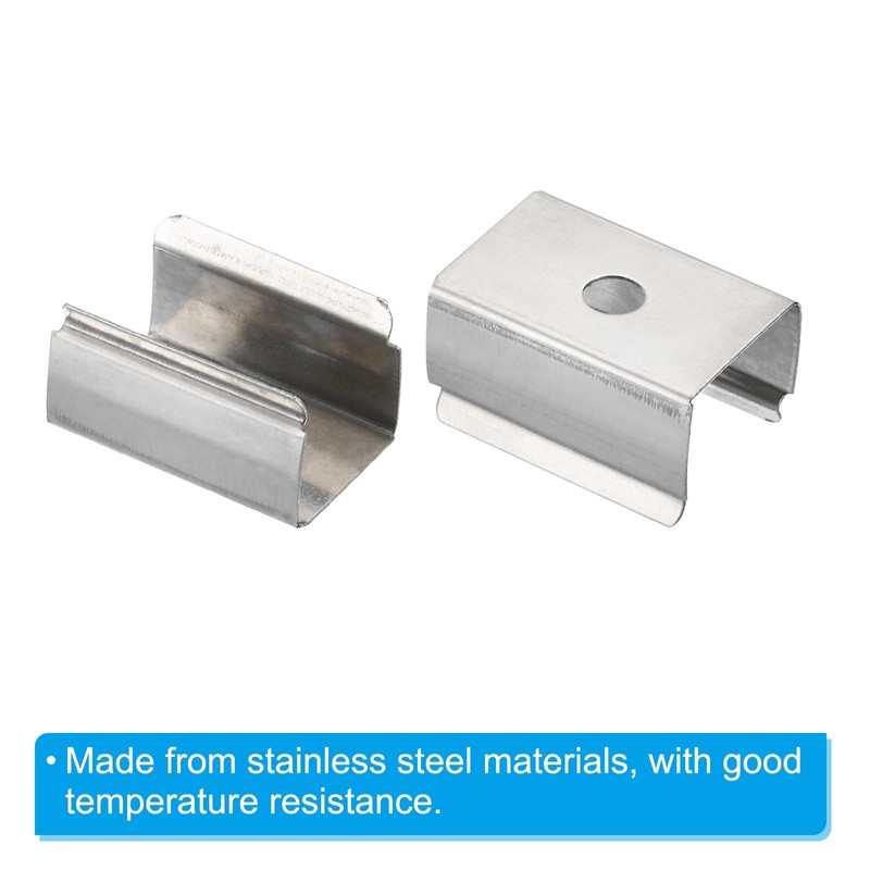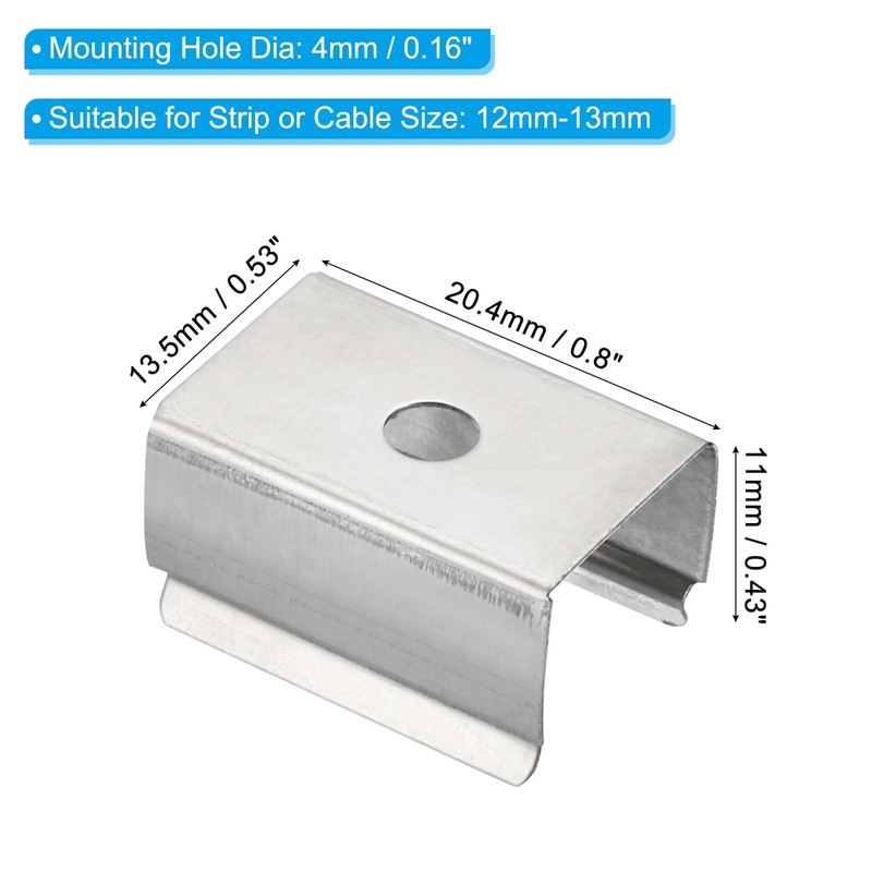 - Color: Silver; Material: Stainless Steel; Total Size: 20.4mmx13.5mmx11mm / 0.8"x0.53"x0.43"; Inner Width: 10.8mm / 0.43"; Suitable for Strip or Cable Size: 12mm-13mm; Mounting Hole Dia.: 4mm / 0.16"; Packing List: 100 Pack x LED Strip Light Clips, 100 Pack x Screws
