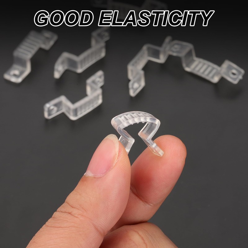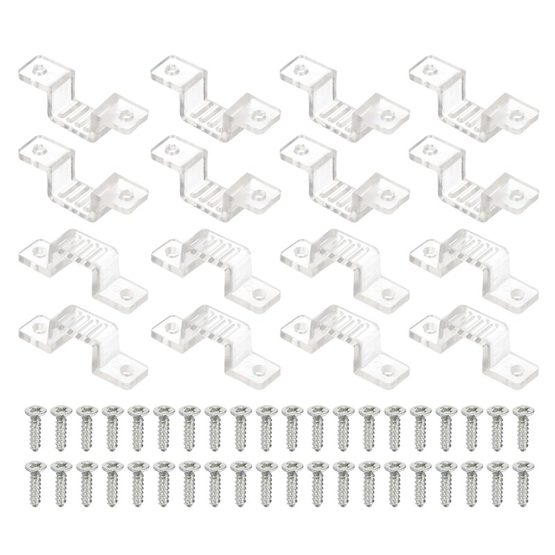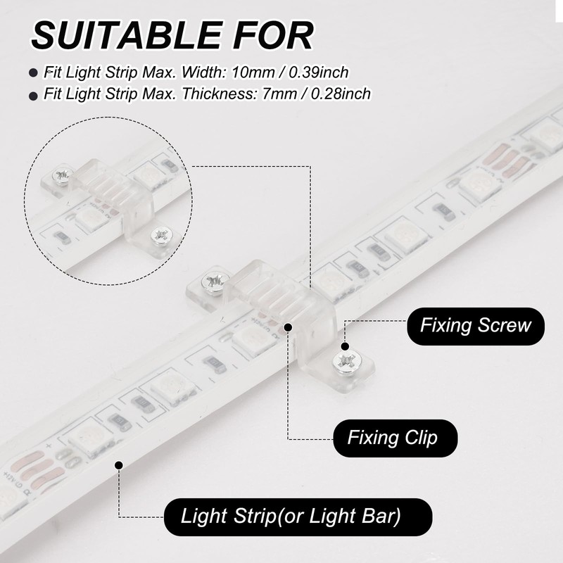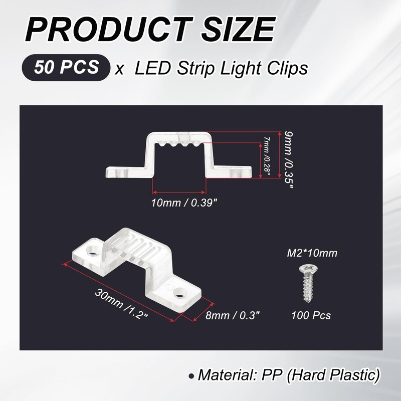 - Specification: Color: Transparent; Material: PP (Soft Plastic); Total Size: 30x8x2mm / 1.2x0.3x0.1inch; Inner Size: 10x7mm / 0.39x0.28 inch (W*T); Fit Light Strip Max. Width: 10mm / 0.39inch; Fit Light Strip Max. Thickness: 7mm / 0.28inch; Mounting Hole Dia.: 3mm / 0.12inch; Screws Size: M2*10mm; Packing List: 50 Pack x LED Strip Light Clips, 100 Pack x Screws.