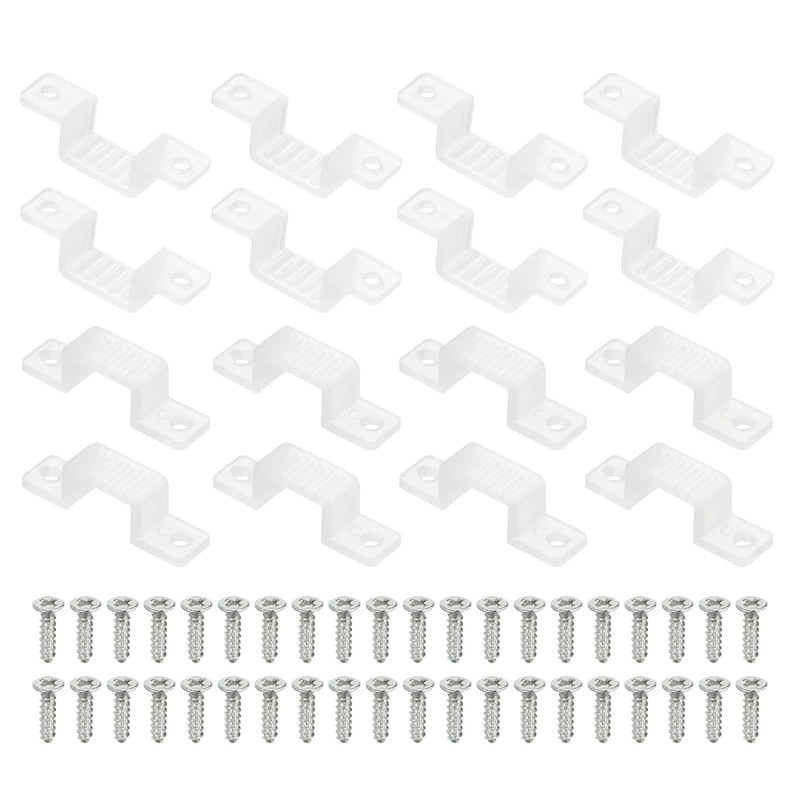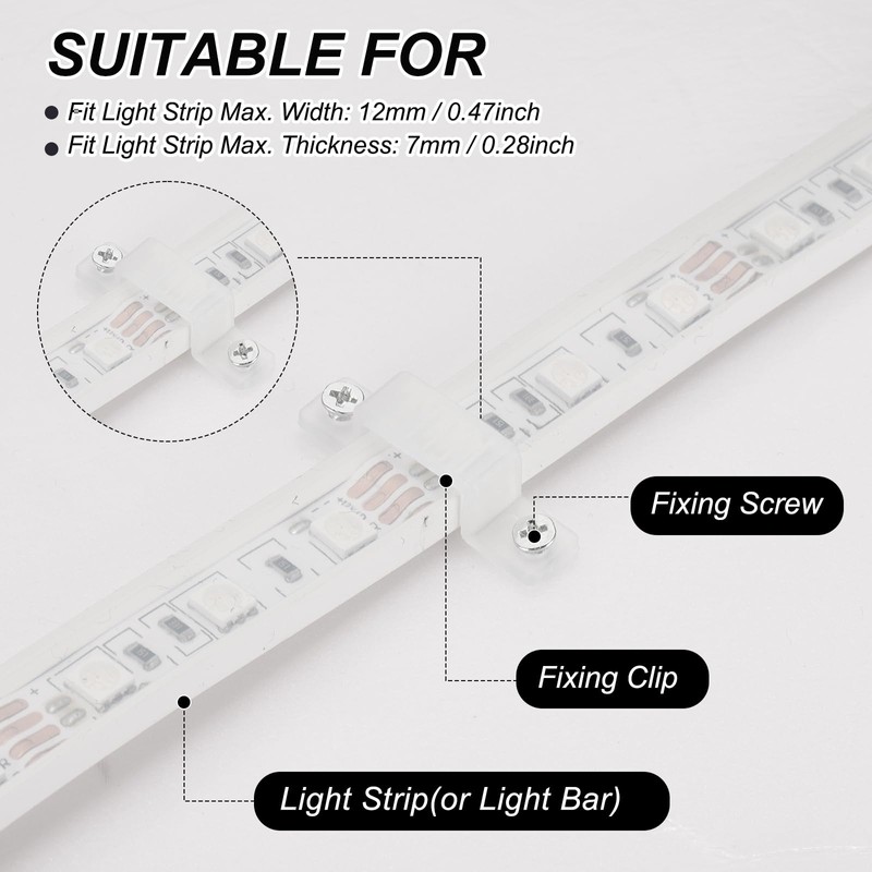 • Specification: Colour: Transparent; Material: PP (hard plastic); Total size: 32 x 8 x 2 mm / 1.3 x 0.3 x 0.1 inches; Inner size: 12 x 7 mm / 0.47 x 0.28 inches (W x D); Max. Width of the light strip: 12 mm / 0.47 inches; max. Thickness of the light strip: 7 mm / 0.28 inches; mounting hole diameter: 3 mm / 0.12 inches; screw size: M2 x 10 mm; packaging list: 50 pack x LED strip light clips, 100 x screws.