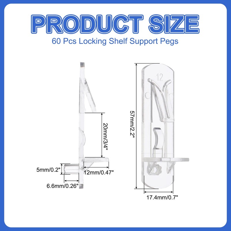 - Material: Plastic; Applicable Shelf Thickness: 20 mm / 3/4 Inch; Pin Size: 5 x 6.6 mm / 0.2 x 0.3 Inch (Dia*L); Bracket Width: 12 mm / 0.5 inch; Shelf Peg Size: 57 x 17.4 mm / 2.2 x 0.7 inch (L*W); Packing List: 60Pcs x Locking Shelf Support Pegs