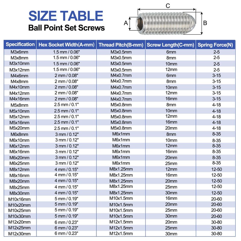 - Thread Size: M10x25mm; Total Length: 27 mm / 1.06 inch; Thread Pitch: M10x1.5mm; Hex Socket Width: 5 mm / 0.2"; Spring Force: 20-60N; Packing List: 6 pcs x Ball Point Set Screws