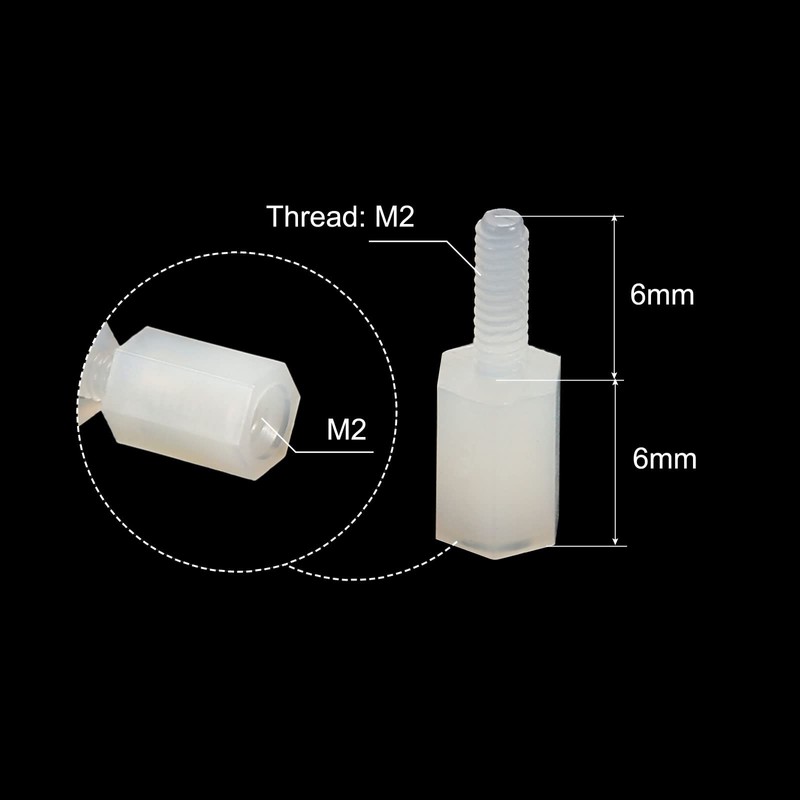 - Specification: Material: Nylon; Thread: M2; Thread Pitch: 0.4mm; Stud Length-Screw Length: 6mm+6mm; Packing List: 50pcs M2x6+6mm Nylon Standoff Spacer, 50pcs M2 Nuts