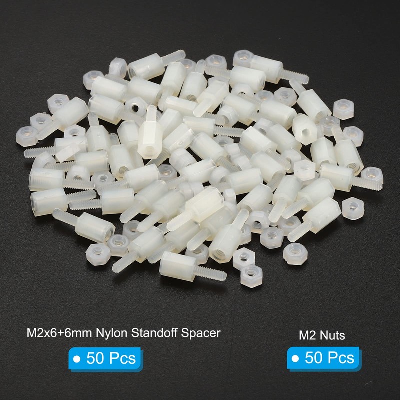 Packing List: 50pcs M2x6+6mm Nylon Standoff Spacer, 50pcs M2 Nuts