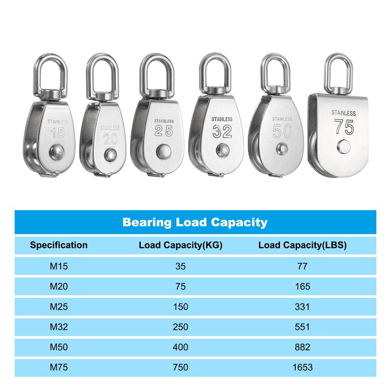 - Material: 304 Stainless Steel | Max. Load Bearing: 250KG / 551LBS | Quantity: 2PCS (1 x Single Pulley, 1 x Double Pulley)