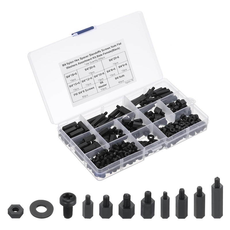- Specification: Material: Nylon; Color: Black; Package List: M4x18+6(10Pcs), M4x20+6(10Pcs), M4x25+6(10Pcs), M4x15+6(10Pcs), M4x12+6(10Pcs), M4x10+6(10Pcs), M4x8+6(10Pcs), M4x6+6(10Pcs), M4x8 Screws(80Pcs), M4 Washers(50Pcs), M4 Nuts(80Pcs)