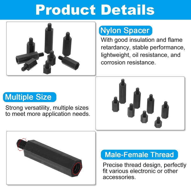 - Advantage: Made of nylon material, nylon spacers with good insulation and flame retardancy, stable performance, lightweight, oil resistance, and corrosion resistance. Strong versatility, multiple sizes to meet more application needs.