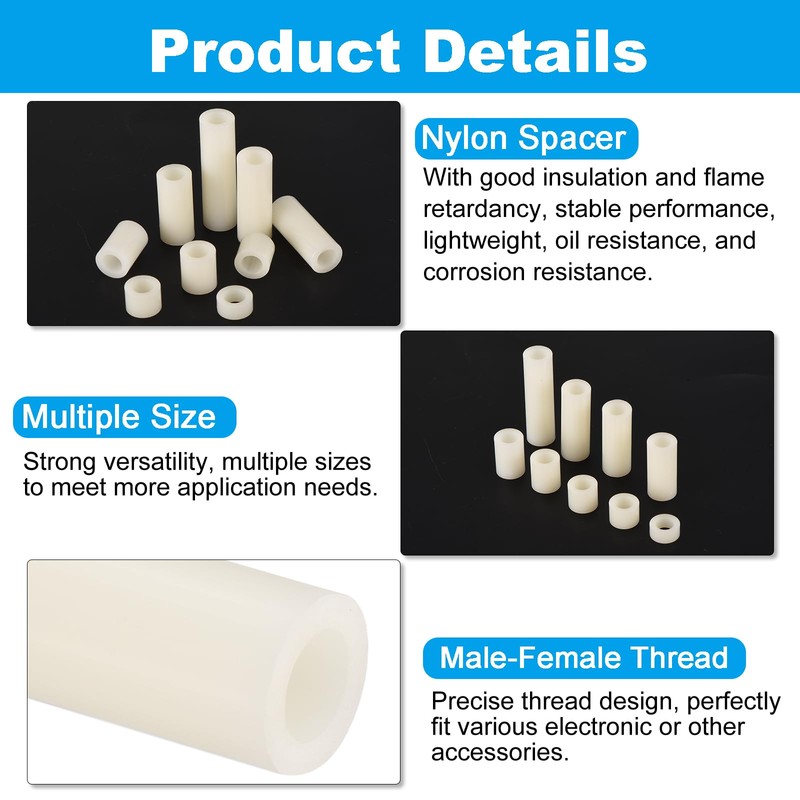 • Advantage: Made from durable ABS material, our nylon spacers feature excellent insulation, flame retardancy, and stability, and are lightweight, oil, and corrosion-resistant. The non-threaded design ensures a flat, smooth surface without burrs for long-lasting use.