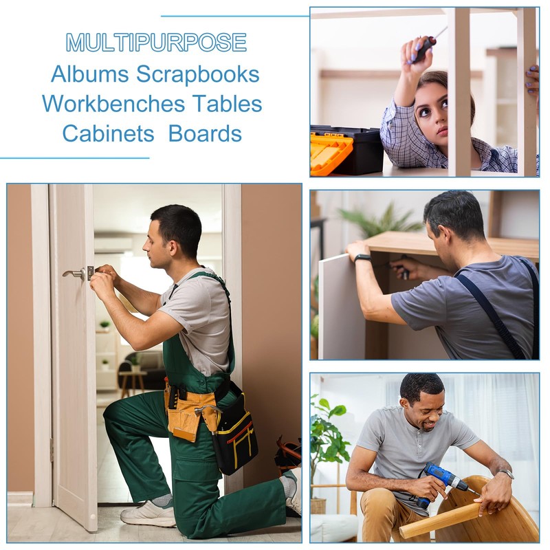 • Application: securing thin photo albums, scrapbooks, leather bags, beds, tables, chairs, workbenches, boards, cabinets, cupboards, and other furniture. Additionally, it is suitable for joining wooden boards together, among other uses.