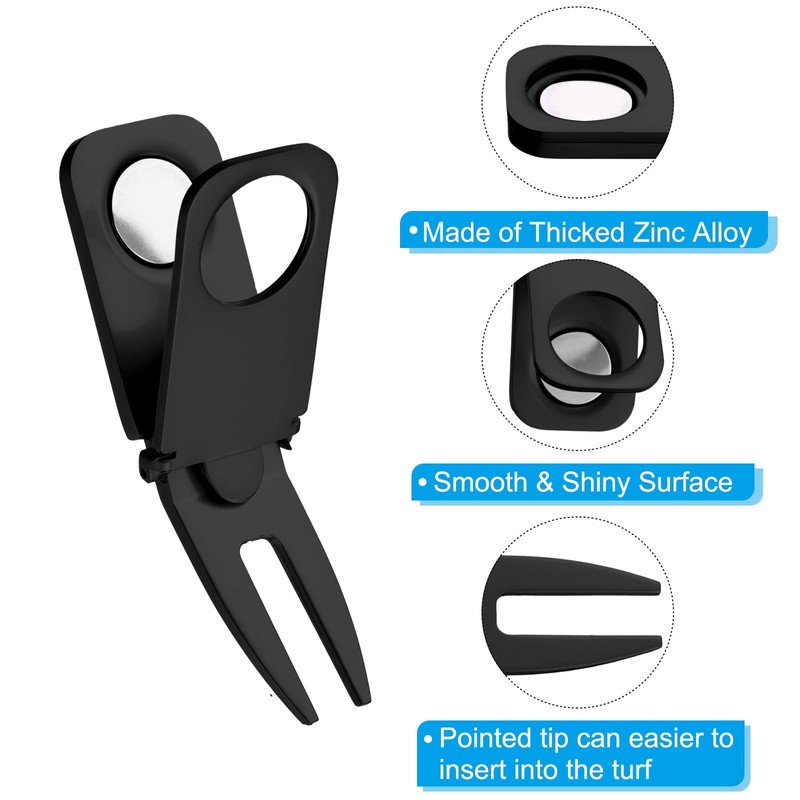 - Advantage: Crafted from a durable zinc alloy with a polished, shiny nickel finish, this golf tool have a sturdy, all-metal construction. 3 in 1 golf divot repair tool conveniently folds flat, allowing you to comfortably keep it in your pocket throughout your round. The magnetic design makes the holder easier to fix the item on the golf cart without worrying about the item slipping off.