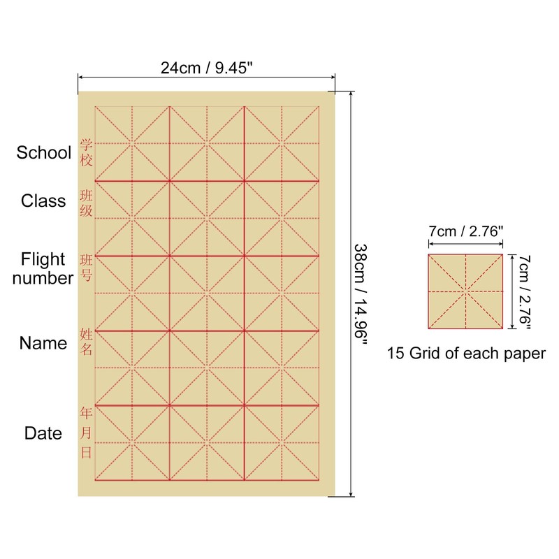 • Specification: Color: Light Yellow Size: 38 x 24 cm/ 14.96 x 9.45 inch (L*W) Grid Size: 7cm/2.76 inch(15 Grid of each paper) Packing List: 70 Sheets x Rice Paper(Half Raw Ripe Xuan)