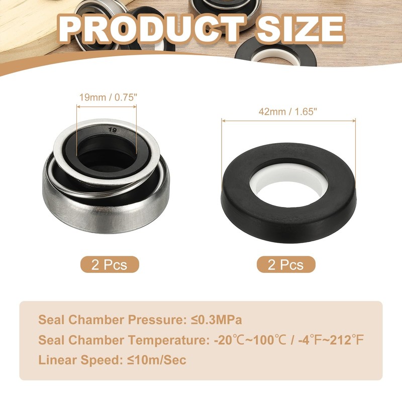 - Inner Dia.: 19mm / 0.75 Inch; Outer Dia.: 42mm / 1.65 Inch; Seal Chamber Pressure: ≤0.3MPa; Seal Chamber Temperature: -20℃~100℃ / -4℉~212℉; Linear Speed: ≤10m/Sec; Packing List: 2Pcs x Mechanical Water Pump Seal