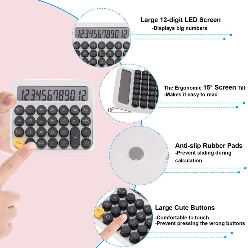 - Advantage: Curved lines and unique retro colors make it suitable for young people, adding beauty to your life; Large 12-digit LED screen displays big numbers. The ergonomic 15° screen tilt makes it easy to read. Large curved buttons of clear sound are comfortable to touch. Anti-slip rubber pads prevent sliding during calculation; Automatically powers off saves you much power. A lightweight and well-sized calculator allows you to take it anywhere for work and handheld use.
